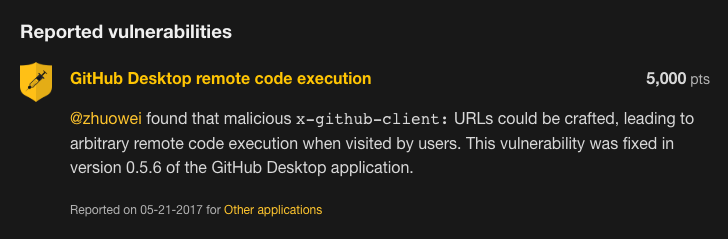 I was invited to H1-702 2018, a HackerOne live-hacking event in Las Vegas that paid over $500k dollars in bounties. One of the targets of this event was GitHub. I like to hack software I use everyday, because I already know lots of features in advance, so I felt GitHub would be a good target. I started playing with GitHub Desktop and found a way to achieve RCE in OSX. But, guess what? It was out of scope for the event! It’s also out of scope in the normal program, but you can read that “occasionally, exceptional reports are rewarded at our discretion on a case by case basis.”