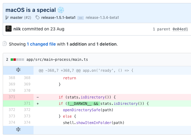 Opening an URL like this would pop a calculator, so at this point it was possible to escape the repository directory, and arbitrary apps or files could be opened in the filesystem. However, a respository can contain an app for OSX, which is basically a directory with the Application Bundle. First, I thought that OSX would be able to detect that this app was downloaded from the Internet. Since the app is cloned through Git the OS will not prompt the user to confirm this action. What’s the root cause of the problem?